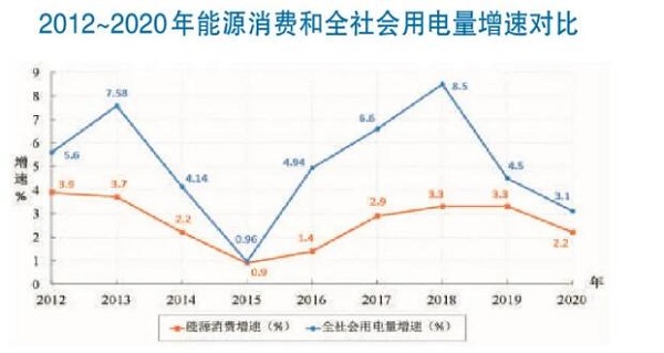 根据国家统计局和国家发展改革委近期发布的数据,2020年我国国内生产总值比2019年增长2.3%,能源消费总量同比增长2.2%,全社会用电量同比增长3.1%。由此计算可知我国单位产值能耗下降0.1%,单位产值电耗增长0.8%。能源消费弹性系数为0.96,电力消费弹性系数为1.35。在单位产值能耗下降的同时电耗增长明显,表明我国终端能源消费构成中的电力比重明显提高,我国电气化水平持续提升。