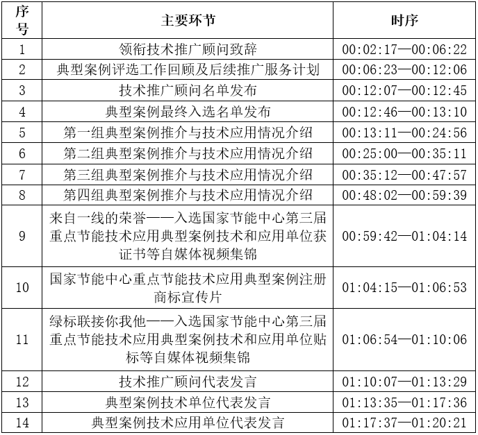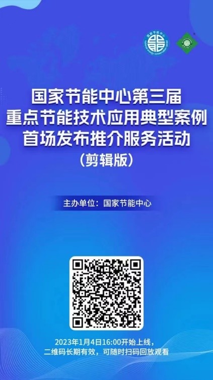 为推进节能降碳先进技术推广应用,更好地发挥绿色技术示范引领作用,扩大本届典型案例技术推广工作力度,2022年12月30日,国家节能中心在京以“线上+线下”相结合方式开展了第三届重点节能技术应用典型案例(2021)首场发布推介服务活动。活动受到社会各有关方面广泛关注和赞誉。应广大用户的要求,我们对整场活动视频录像进行了精简剪辑,突出了本届典型案例技术的宣传推介内容,并于2023年1月4日16:00上线发布,以供各需求方观阅了解,欢迎扫码随时回看本次活动,此二维码长期有效。本届典型案例首场发布推介服务活动主要环节和时序安排见下表。
