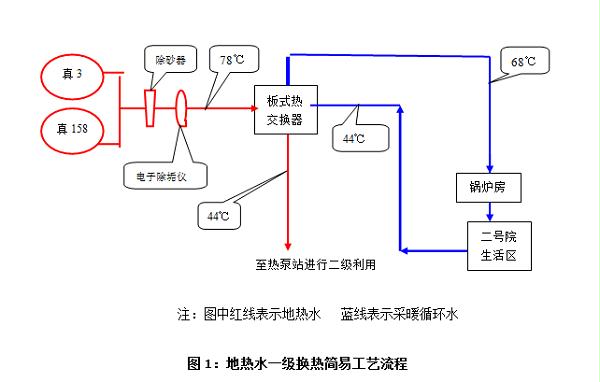 为借助油田在地热资源开发与应用中拥有得天独厚的优势。按照“变费为宝,因陋就简,服务于民,切实建造综合效益最大化样板工程”的部署要求,针对水乡油田开发时间长,靠近生活矿区的真3、真158两口报废油井,通过组织地质勘查和研究分析,采取了油气层堵封、射开水层等一系列措施,经配置除砂器、电子除垢仪、板式热交换器和水源热泵等装置,实现了将地热间接传递矿区采暖回水的一、二级换热,从而达到了降低采暖锅炉运行负荷、减少能源消耗和氮氧化物排放的目的。