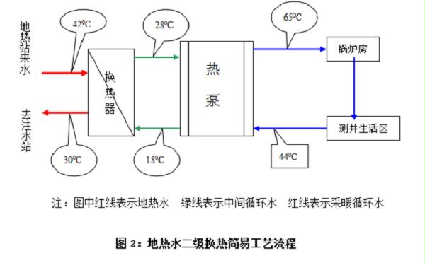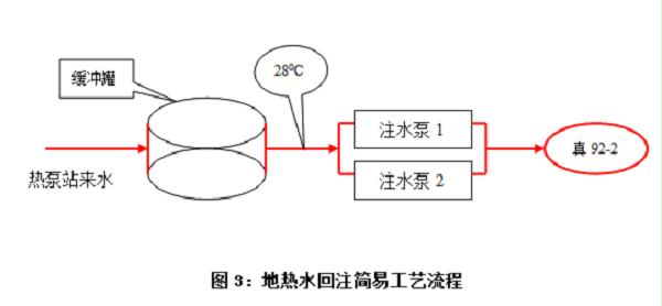 为确保地表上下资源平衡,经换热后的地热水,选择与真3、真158同层位的真92-2井作为回注井,通过配置两台装机容量110kW的注水泵(一备一运),将换热后的地下水进行回注,从而完成地热水资源循环往复的有效利用。地热水资源一、二级换热及回注简易流程见图1、图2、图3: